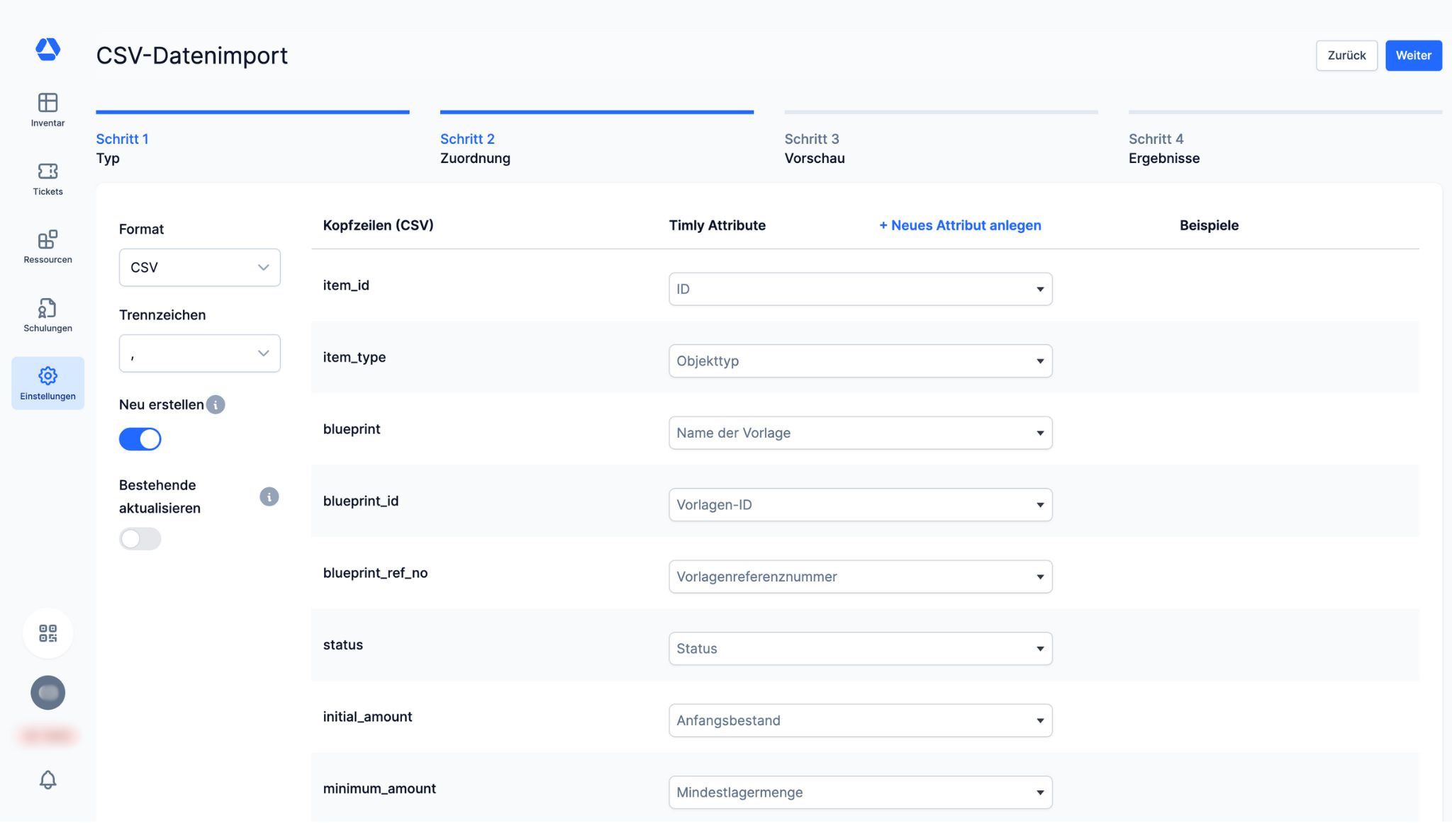 Es ist auch möglich, bestehende Datensätze zu ergänzen. Wählen Sie dazu in Schritt 2 während der Attributzuordnung die Option „Bestehende aktualisieren“. Der einfachste Weg, ein Update durchzuführen, besteht darin, zunächst die Daten aus Timly über die Option „Inventar CSV“ für die zu aktualisierenden Elemente zu exportieren. In diesem Fall sind die Tabellen bereits korrekt formatiert, und Sie können die gewünschten Datensätze problemlos hinzufügen.