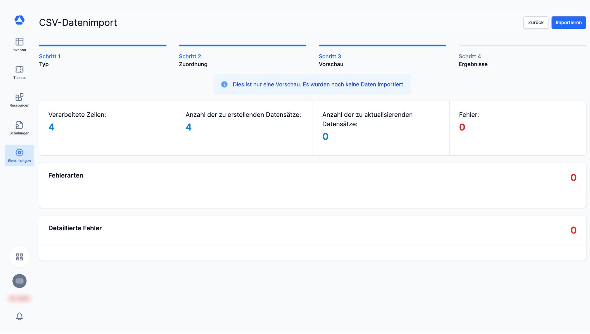 Unterhalb der Zusammenfassung werden detaillierte Fehlermeldungen angezeigt – einschließlich der Art des Fehlers und betroffener Zeilen – sodass Sie diese vor dem Import korrigieren können. Sie können zu Schritt 1 oder 2 zurückkehren, um Fehler zu beheben. Datensätze werden erst erstellt oder aktualisiert, wenn Sie auf „Importieren“ klicken. Diese Aktion ist irreversibel; vor dem Fortfahren wird eine Bestätigung angezeigt.