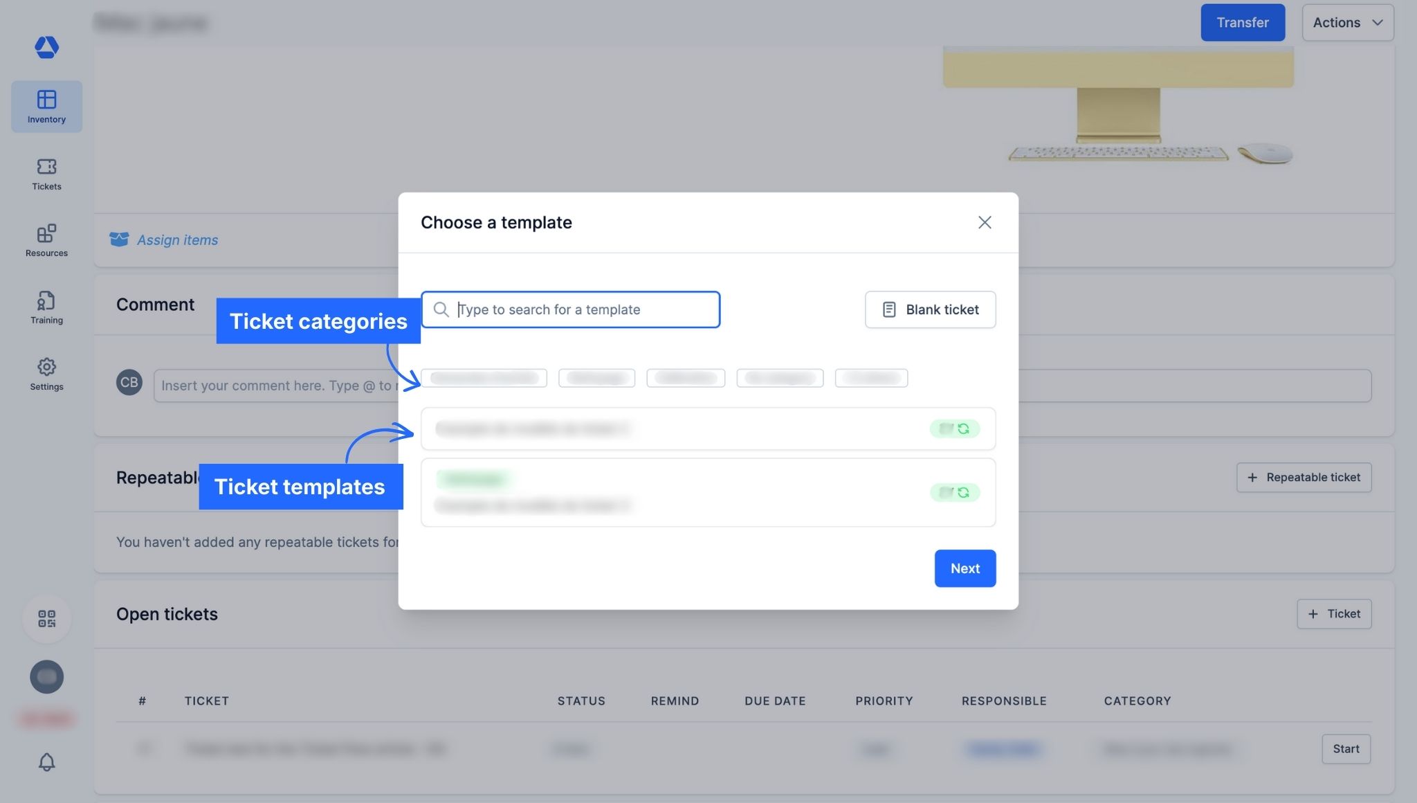 - Optional: Search for the template name or click a ticket category to find it faster