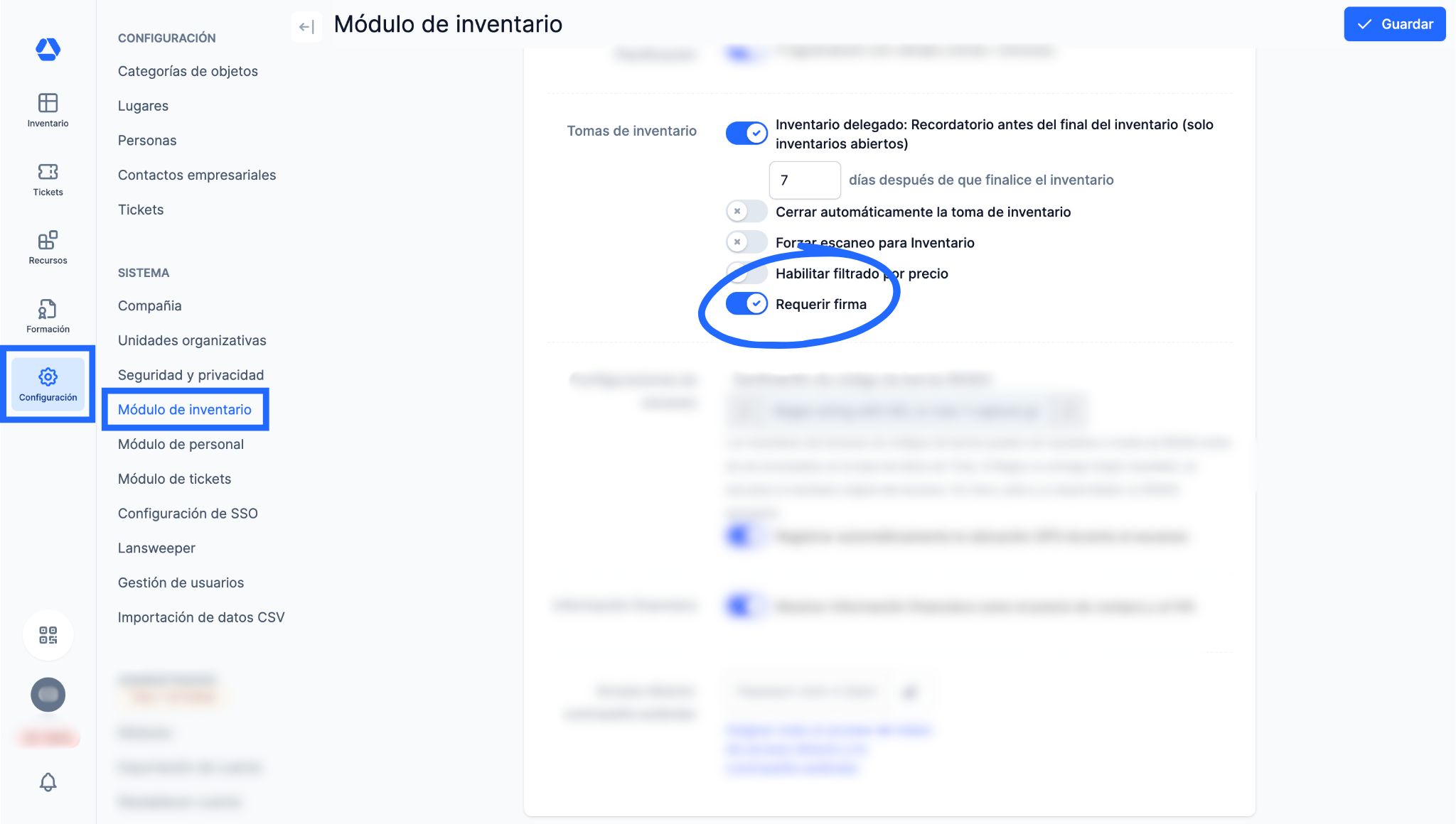 💡El interruptor "Permitir firmas para contenedores" habilita las firmas para lugares (por ejemplo, obras). Al activar esta opción, el responsable de sitio puede validar asignaciones, devoluciones u otras acciones para ese lugar.