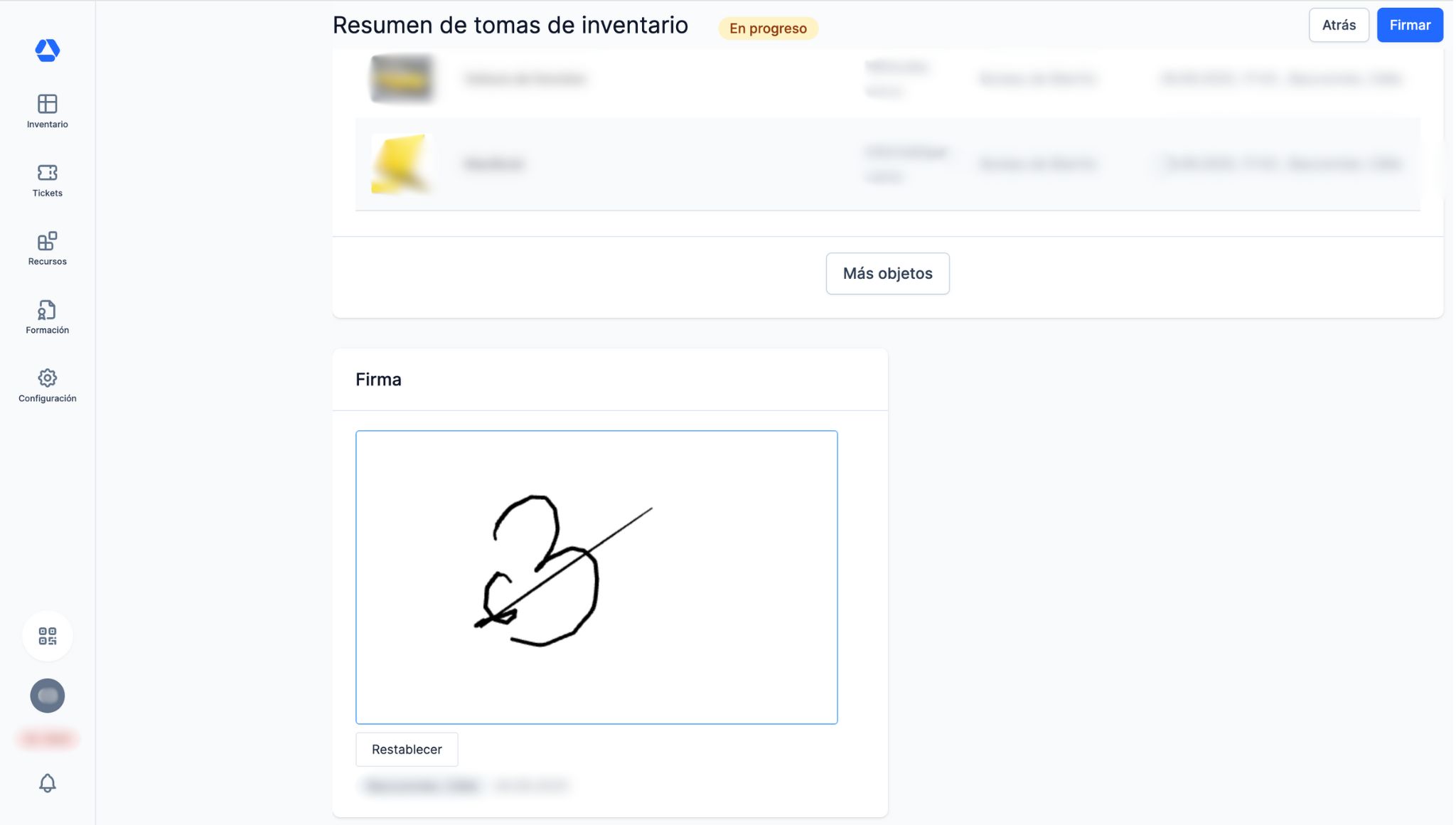 - En la página de resumen de tomas de inventarios, desplázate hasta la sección de firma digital firma tú (o haz que la persona responsable firme) y haz clic en "Firmar" para cerrar la toma de inventario.