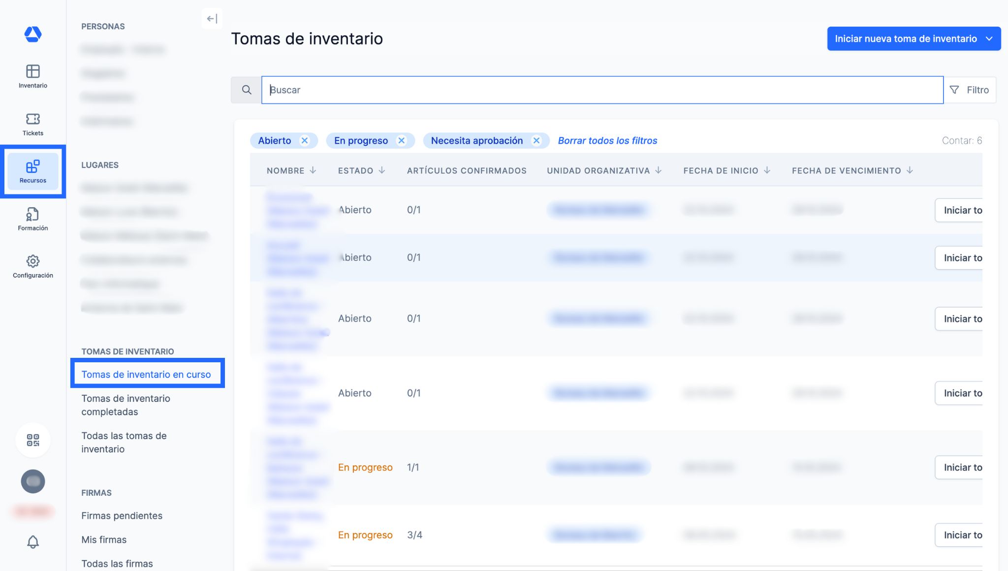 - Ve a "Recursos" y luego a "Tomas de inventario en curso". Elige: