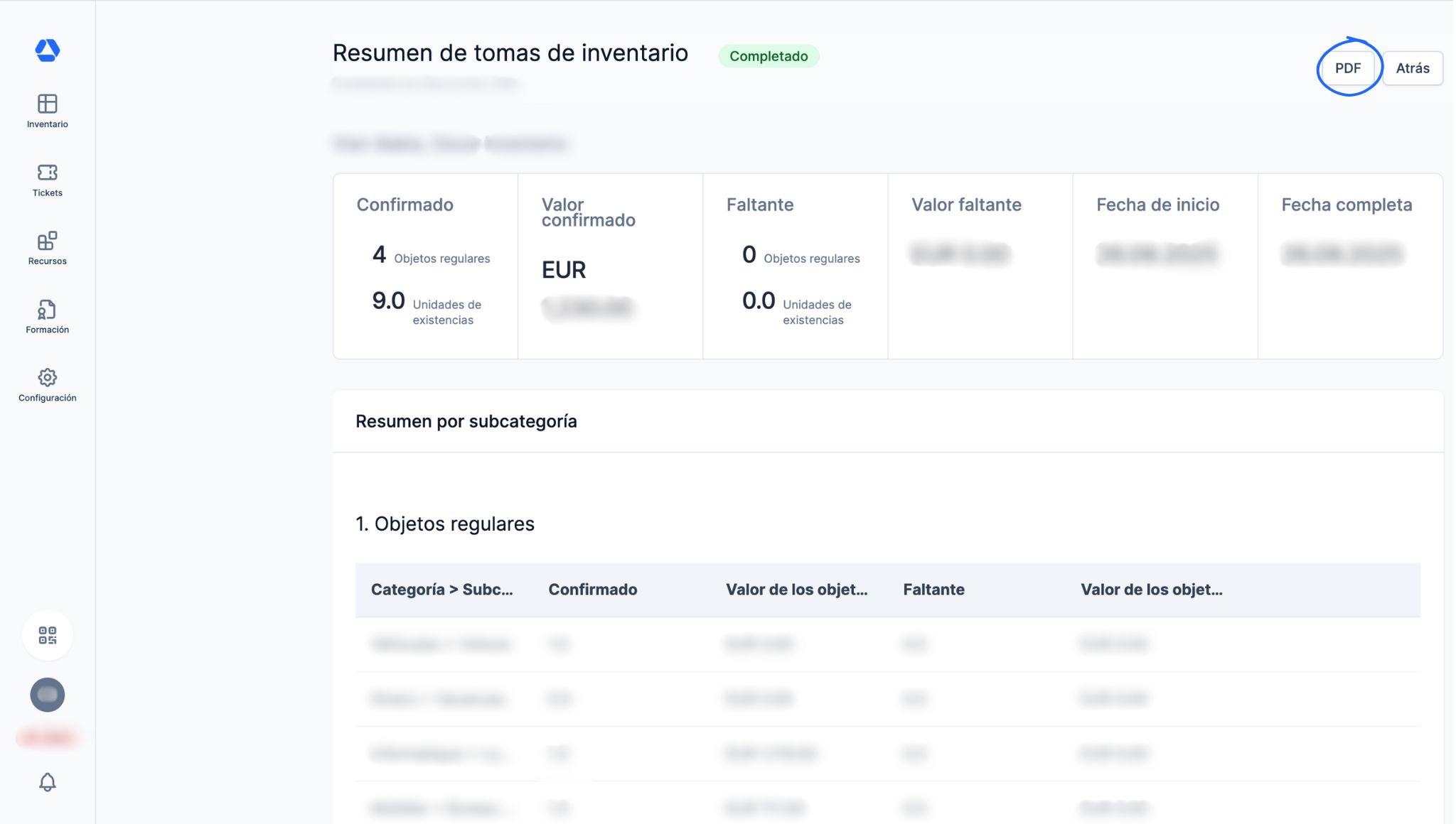 - Una vez cerrada la toma de inventario, haz clic en "PDF" para generar el resumen de la toma de inventario, incluyendo la firma digital.