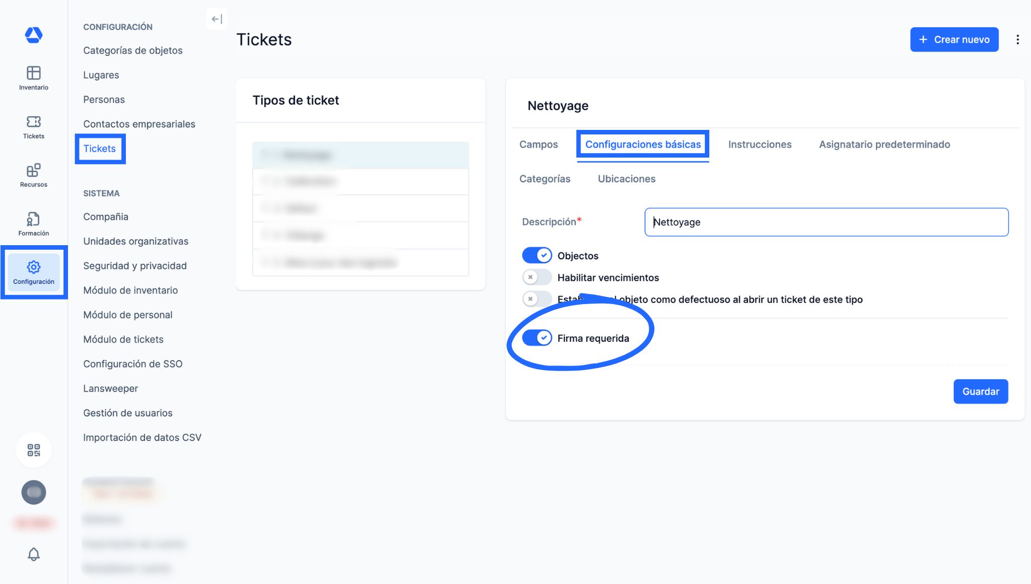 💡Puedes configurar las firmas de manera granular: la firma puede ser obligatoria únicamente para ciertos tipos de tickets (por ejemplo, los relacionados con mantenimiento crítico o seguridad), y opcional o deshabilitada para otros
