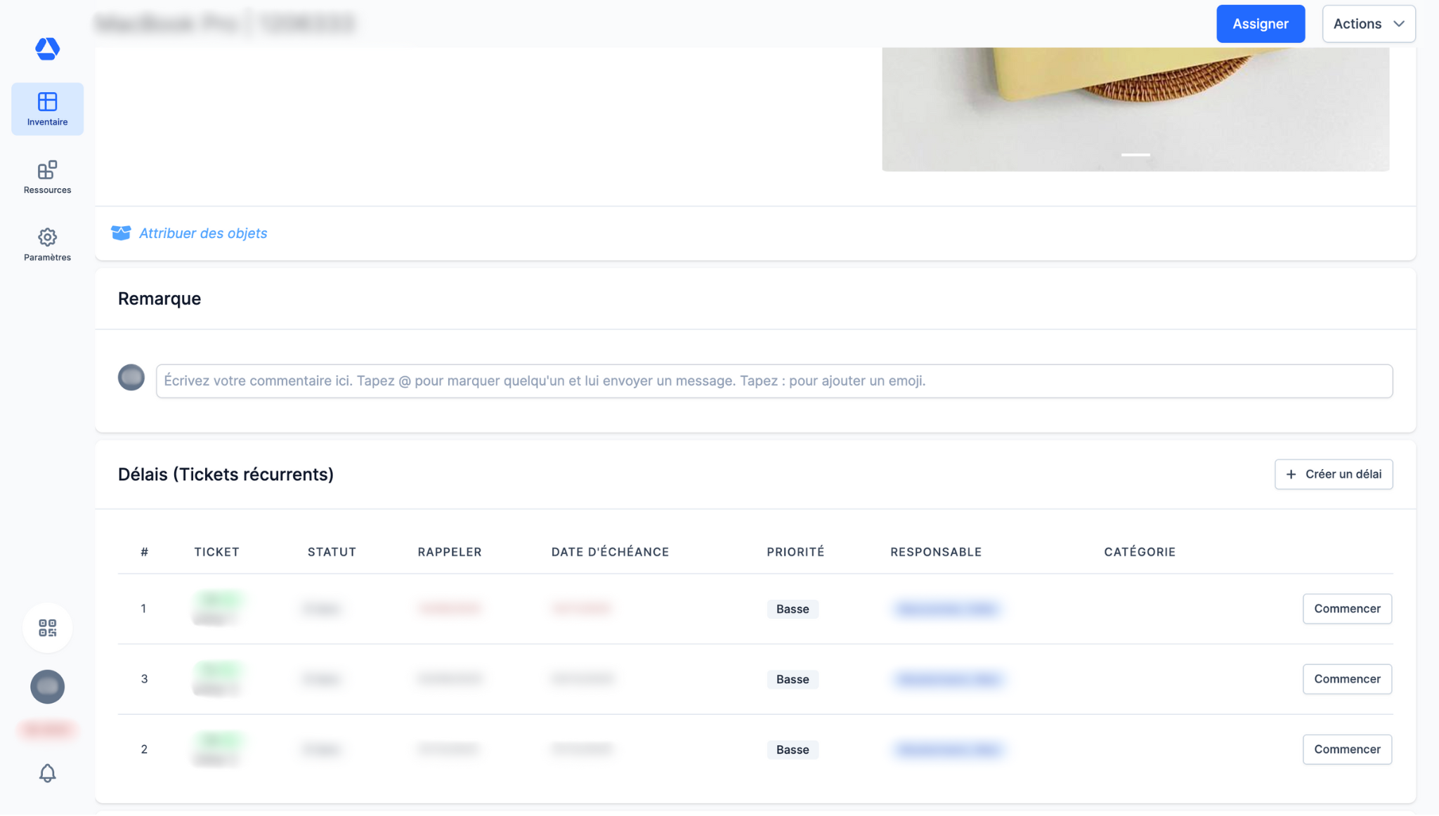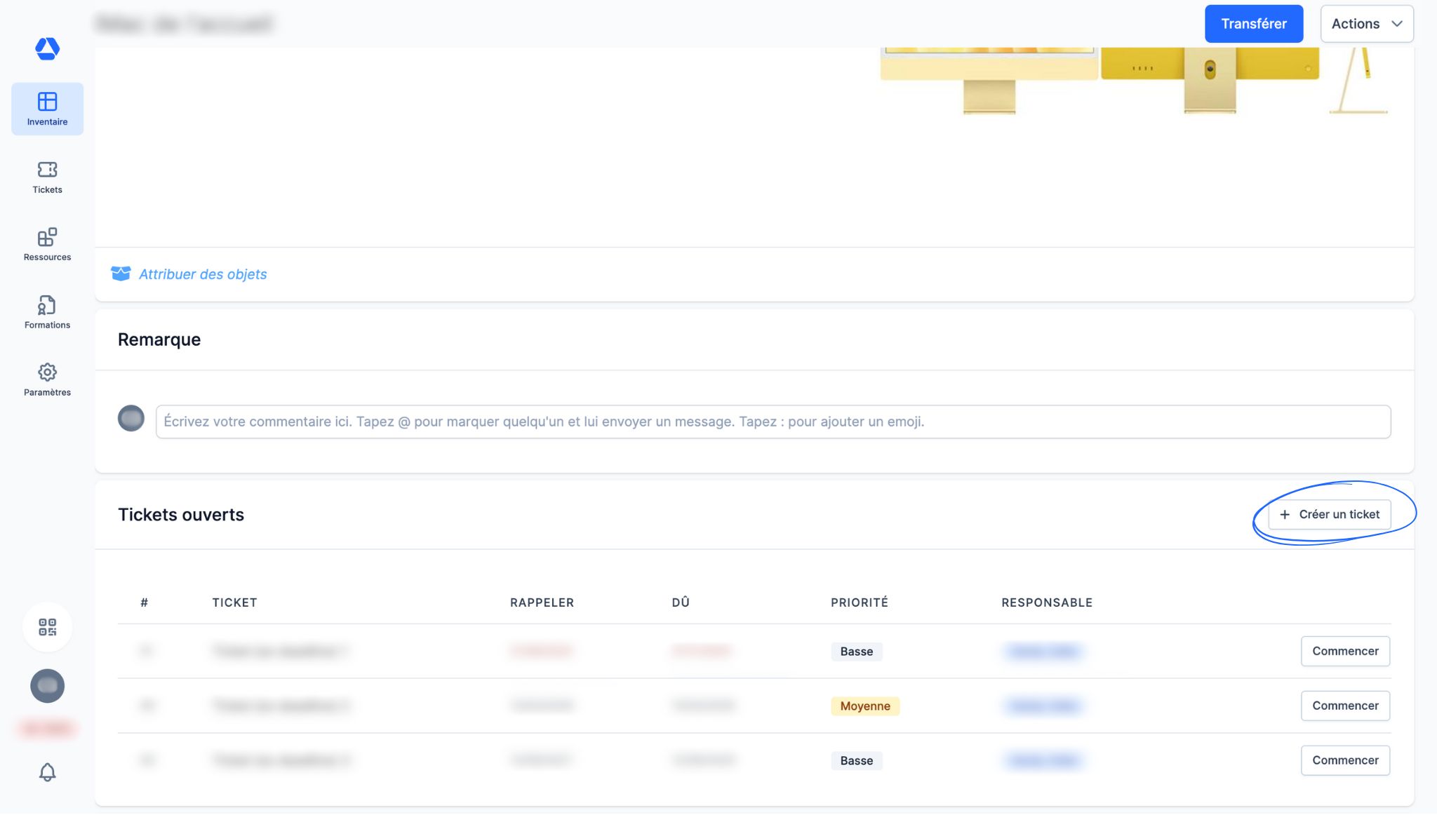 Pour créer un ticket depuis la fiche d'identité d'un objet, il vous suffit de :