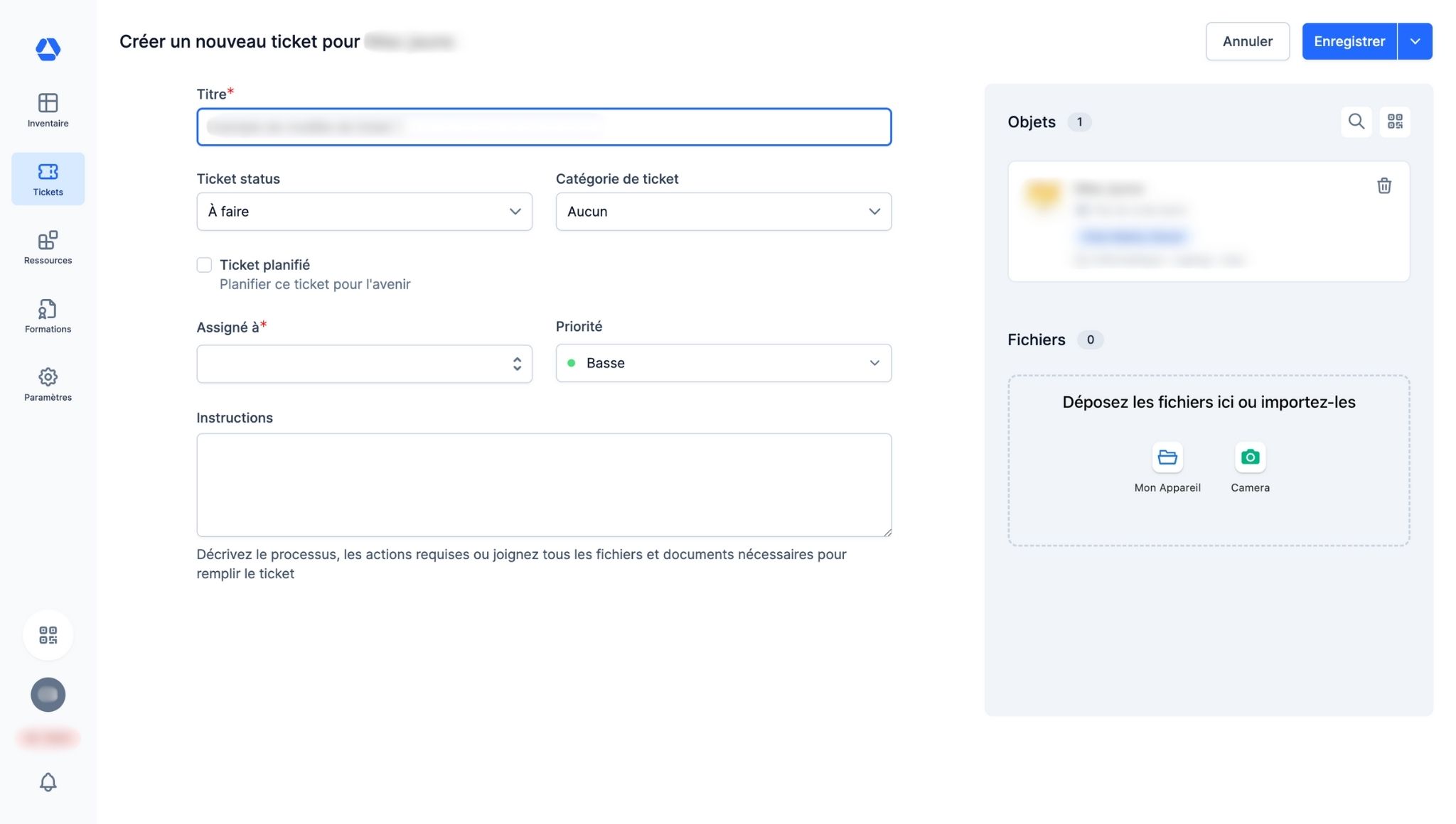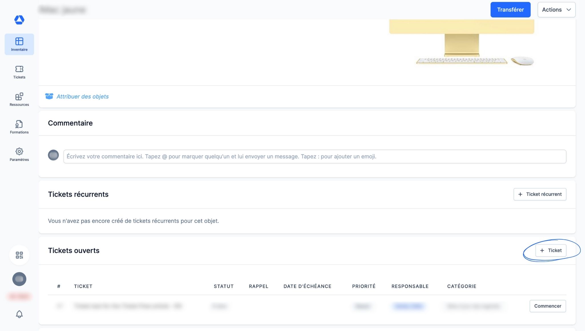 Pour créer un ticket depuis la fiche d'identité d'un objet, il vous suffit de :