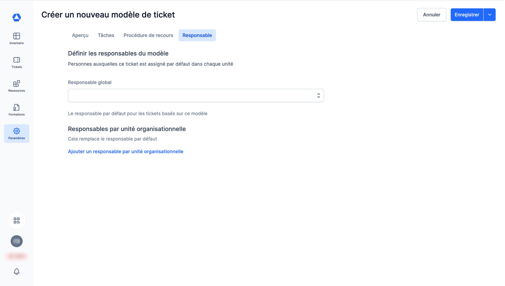 - « Responsable global » (dans le menu déroulant, sélectionnez la personne responsable pour ce modèle de tickets, toutes unités organisationnelles confondues)
