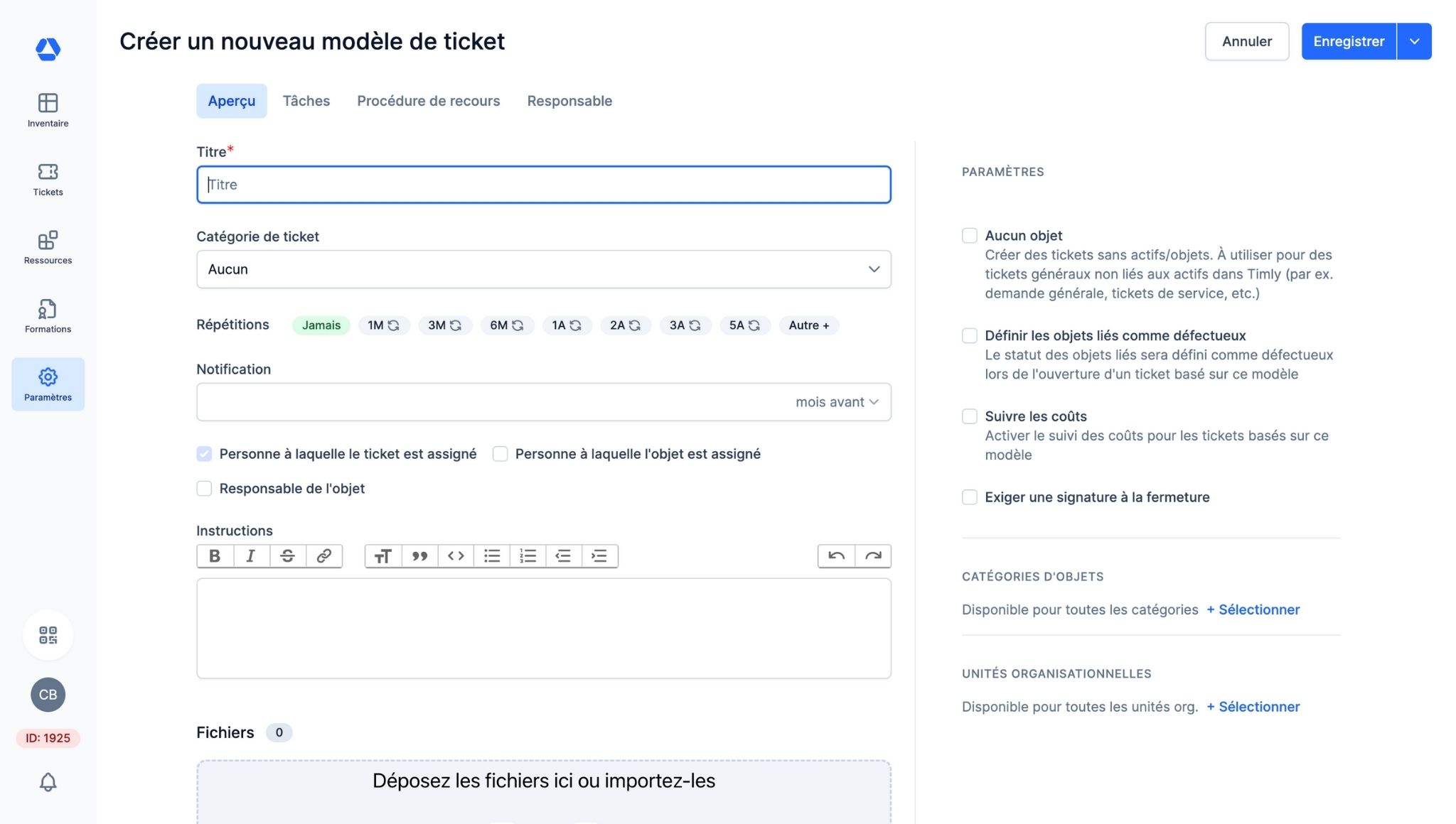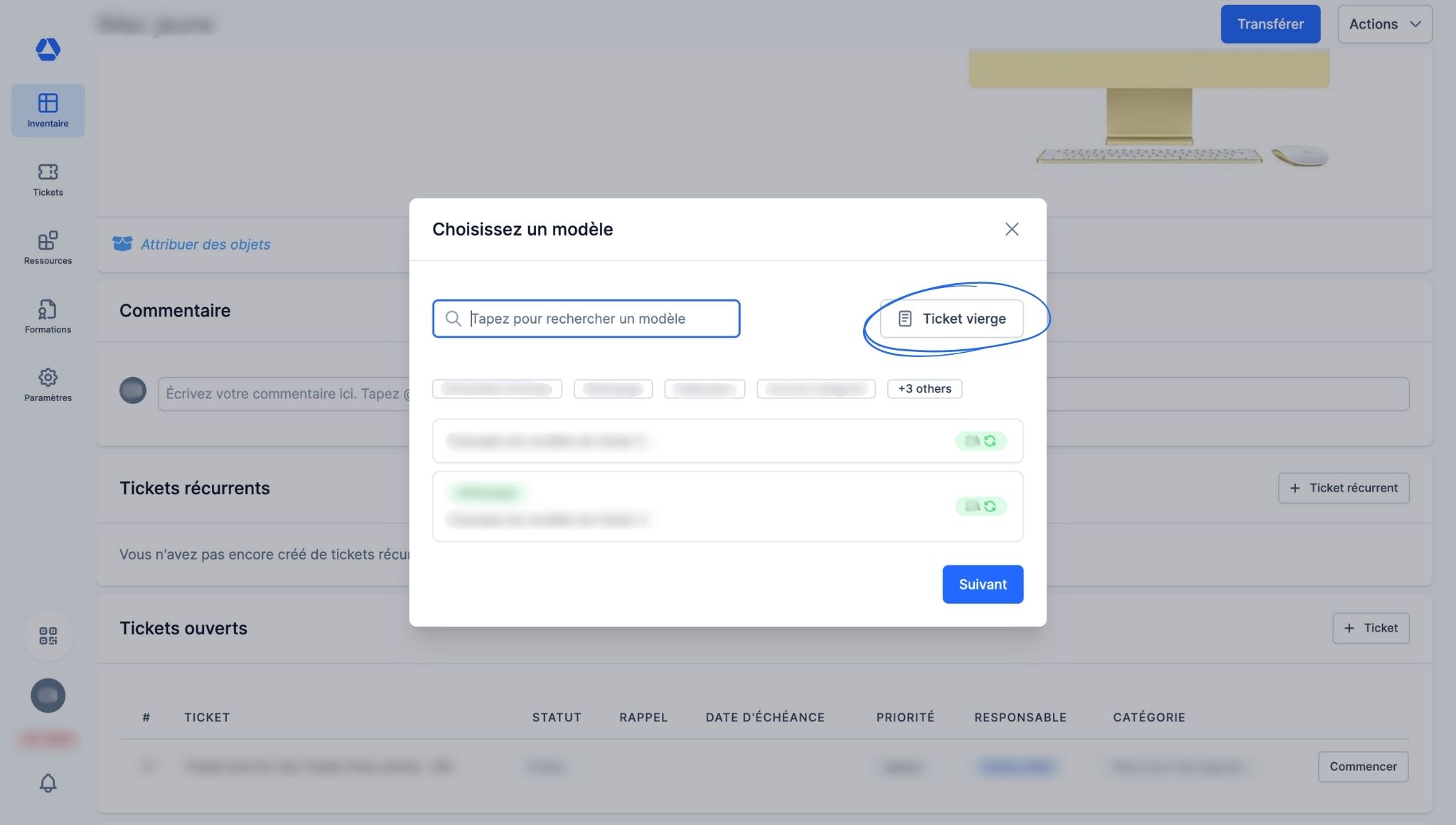 Vous pouvez désormais créer un ticket vierge (récurrent ou non). Cela signifie que ce ticket n’est associé, par défaut, à aucun modèle ni à aucune catégorie de ticket.